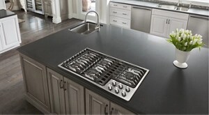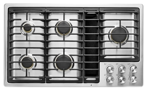 This JennAir® luxury gas downdraft cooktop features five sealed burners, including a 17,000 BTU ultra-high output burner. Its impressive JX3™ downdraft ventilation system quickly and efficiently clears the air without a hood.