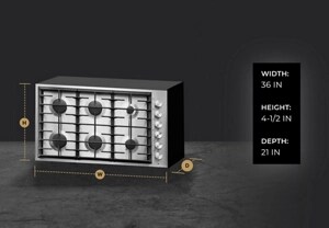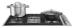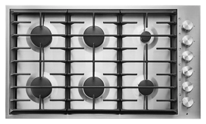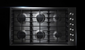 With a combined 78,000 BTUs of power, this luxury JennAir® gas cooktop is an exceptionally robust six-burner, 36-inch cooktop. Its Simmer/Melt Burner reaches as low as 800 BTU, while an extremely low profile allows for near-flush countertop installation.