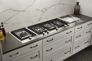 Stands just 3 millimeters above the countertop surface creating a uniform, minimal look — nearly flush with the countertop — among select Jenn-Air® cooking appliances.