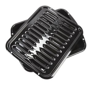 Model 4396923 Premium Broiler Pan holds food above the grid to allow air to circulate completely around all surfaces during the cooking cycle. This pan is designed to drain juices away from food and help prevent splatter and smoke during broiling. This set includes (1) black porcelain roasting rack and (1) black porcelain broiler pan. Size: 16-3/4-IN L x 12-3/4-IN W x 1-1/2-IN H. Using this pan will not require any tools, disassembly, or repair experience