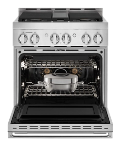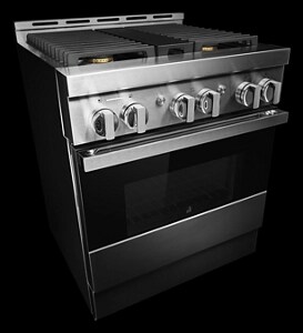 Precise, dual flames produced by precision-drilled brass burners. Inside the oven cavity, steady heat weaves around each flat tine. From searing select cuts and simmering sauces to succulent roasts, these ranges offer unmistakable firepower.