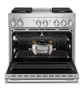 Precise, dual flames produced by precision-drilled brass burners. Inside the oven cavity, steady heat weaves around each flat tine. From searing select cuts and simmering sauces to succulent roasts, these ranges offer unmistakable firepower.