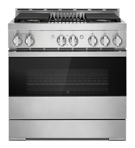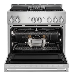 Precise, dual flames produced by precision-drilled brass burners. Inside the oven cavity, steady heat weaves around each flat tine. From searing select cuts and simmering sauces to succulent roasts, these ranges offer unmistakable firepower.
