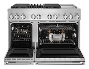 Precise, dual flames produced by precision-drilled brass burners. Inside the oven cavity, steady heat weaves around each flat tine. From searing select cuts and simmering sauces to succulent roasts, these ranges offer unmistakable firepower.