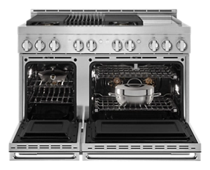 Precise, dual flames produced by precision-drilled brass burners. Inside the oven cavity, steady heat weaves around each flat tine. From searing select cuts and simmering sauces to succulent roasts, these ranges offer unmistakable firepower.