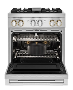 Precise, dual flames produced by precision-drilled brass burners. Inside the oven cavity, steady heat weaves around each flat tine. From searing select cuts and simmering sauces to succulent roasts, these ranges offer unmistakable firepower.