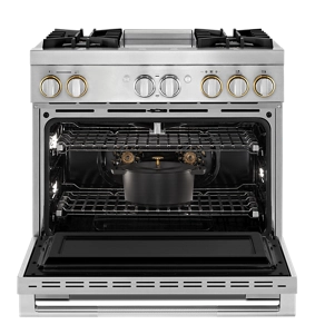 Precise, dual flames produced by precision-drilled brass burners. Inside the oven cavity, steady heat weaves around each flat tine. From searing select cuts and simmering sauces to succulent roasts, these ranges offer unmistakable firepower.