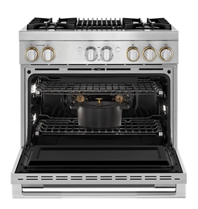 Precise, dual flames produced by precision-drilled brass burners. Inside the oven cavity, steady heat weaves around each flat tine. From searing select cuts and simmering sauces to succulent roasts, these ranges offer unmistakable firepower.