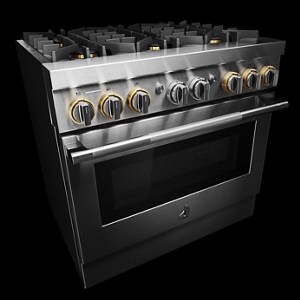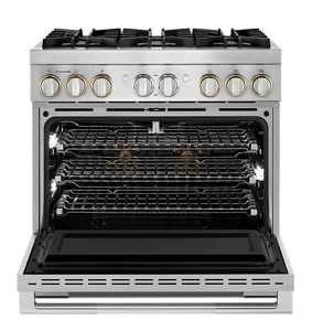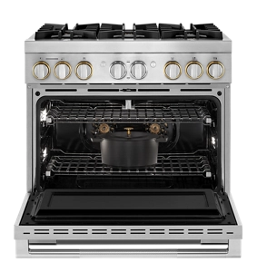 Precise, dual flames produced by precision-drilled brass burners. Inside the oven cavity, steady heat weaves around each flat tine. From searing select cuts and simmering sauces to succulent roasts, these ranges offer unmistakable firepower.