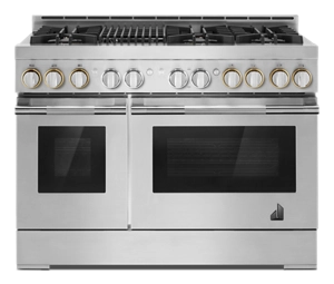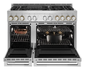 Precise, dual flames produced by precision-drilled brass burners. Inside the oven cavity, steady heat weaves around each flat tine. From searing select cuts and simmering sauces to succulent roasts, these ranges offer unmistakable firepower.