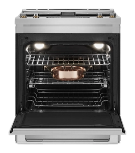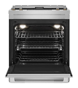 Revel in the power and flexibility of a JennAir® electric downdraft slide-in range. Cook multiple dishes on multiple racks in the 6.2 cu. ft. oven cavity, sauté and simmer on the Dual-Choice™ Element, then utilize a downdraft ventilation system to help draw odors away.