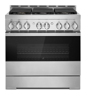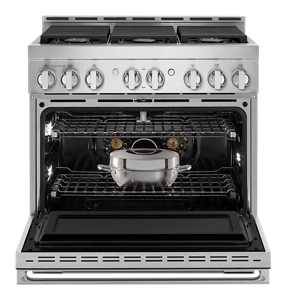 Precise, dual flames produced by precision-drilled brass burners. Inside the oven cavity, steady heat weaves around each flat tine. From searing select cuts and simmering sauces to succulent roasts, these ranges offer unmistakable firepower.