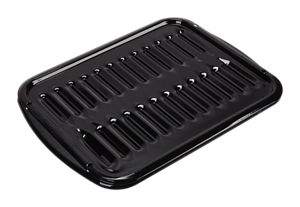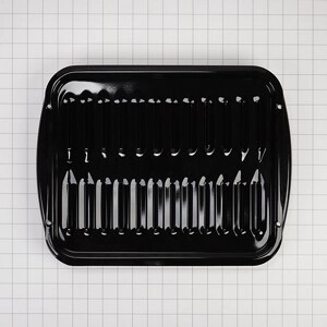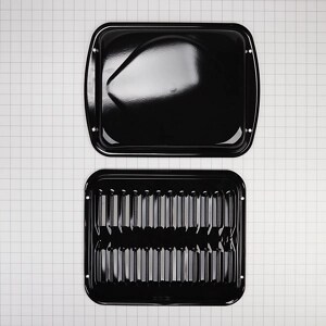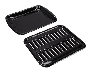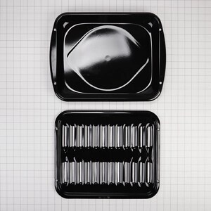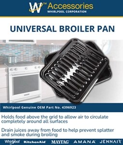 Model 4396923 Premium Broiler Pan holds food above the grid to allow air to circulate completely around all surfaces during the cooking cycle. This pan is designed to drain juices away from food and help prevent splatter and smoke during broiling. This set includes (1) black porcelain roasting rack and (1) black porcelain broiler pan. Size: 16-3/4-IN L x 12-3/4-IN W x 1-1/2-IN H. Using this pan will not require any tools, disassembly, or repair experience