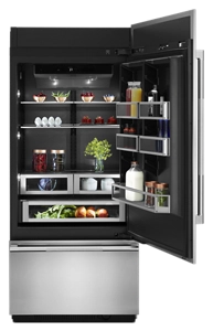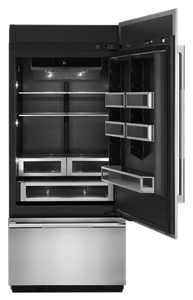 Featuring the exclusive Jenn-Air® Obsidian interior, this bottom-freezer refrigerator offers a fully flush, fully integrated design, distinct fresh- and frozen-food climates, and Produce Preserver to help keep fruits and vegetables at optimum freshness.