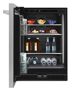 Make room for guilty pleasures. Every delicious morsel is tucked behind a thermal glass door, nearly floating on solid glass and awash in soft LED light. Let refreshments—liquid or otherwise—wait in chilled bliss.