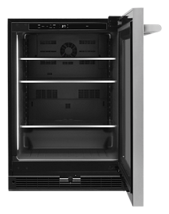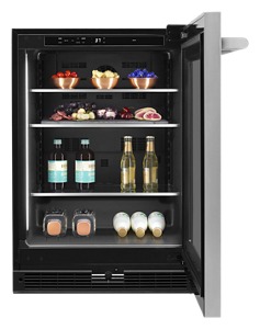 Make room for guilty pleasures. Every delicious morsel is tucked behind a thermal glass door, nearly floating on solid glass and awash in soft LED light. Let refreshments—liquid or otherwise—wait in chilled bliss.